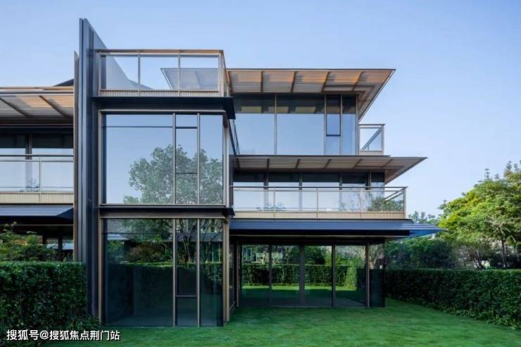 落地窗上,镶上金色铝线条“油画框”。再辅以三面环绕(边套)的金属引檐,金色的露台栏杆底座,金色的格栅院门,完成“金”之描摹。