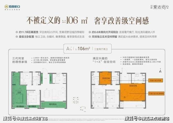 与常见的中间套户型不同,招商爱达1872的约106㎡,南向有3.5开间,面宽约有11.7米。如此一来,可以将更多南向开间面,留给餐客厅,同时外接约5.6米长的南阳台,让公区显得更为阔绰。