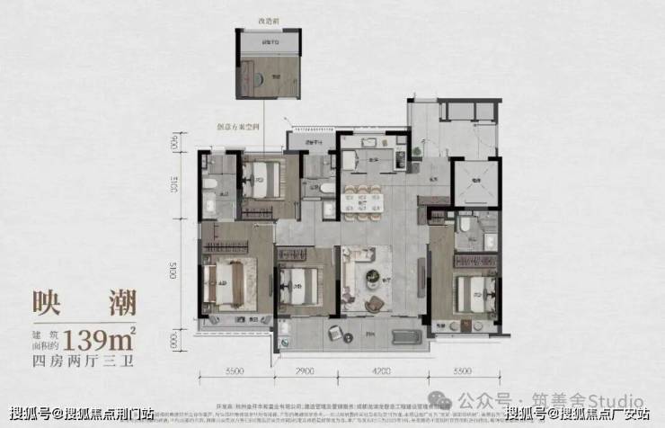 139㎡的四房三卫户型,南向13.9米超宽面宽,四开间朝南,客厅宽达4.2米。更令人惊喜的是,它拥有3个卫生间和双套房设计,并配有阳光入户花园和双重玄关。