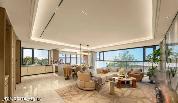 采用270°环幕采光设计,配合大面宽玻璃幕墙,餐客厅形成无遮挡的全景视野。这种设计不仅让室内全域少柱化,更能实现三面采光,将室外的山景或园林景观“框”入室内,采光与观景双在线