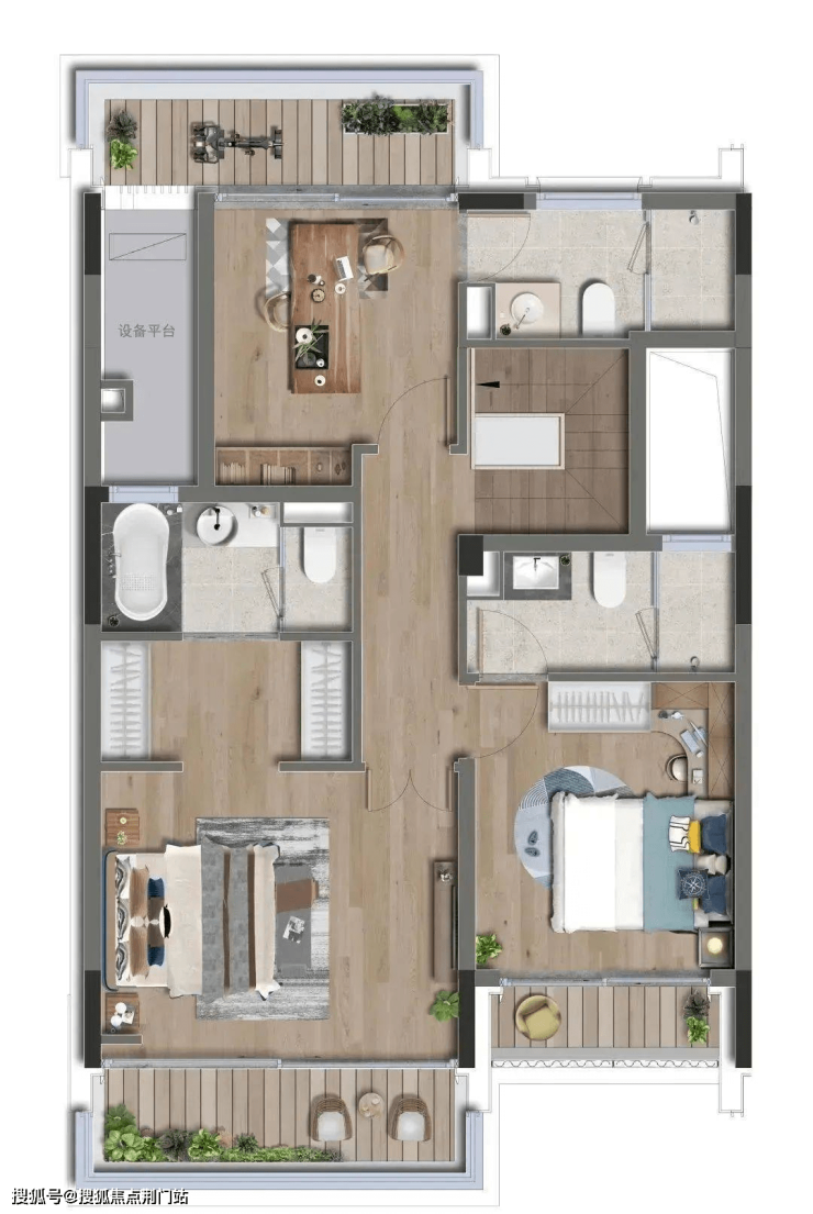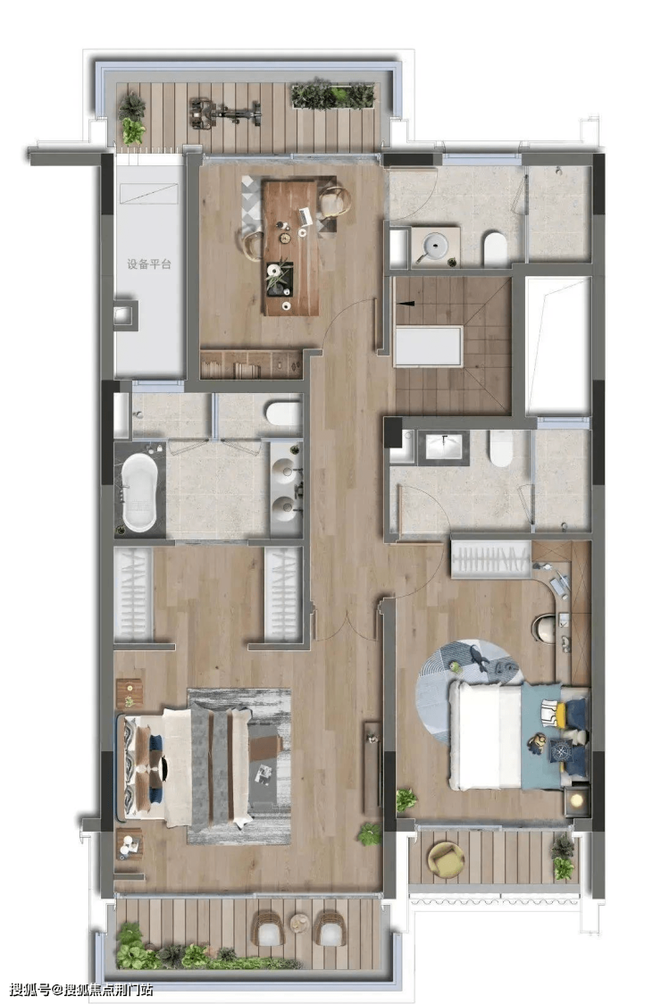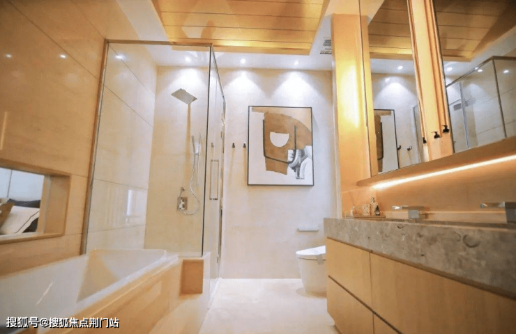 二楼南北三个房间的露台,可以让种花、健身、晾晒等功能自行组合。其中最大的房间约37㎡,为衣帽间提供了专属位置,卫生间约11㎡,放下浴缸绰绰有余。大尺度给足了住户的安全感和舒适度。
