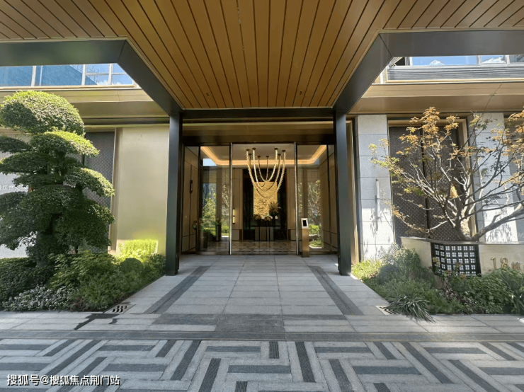 大门取意宋代二坡顶形制,整个大门约43.8米宽、约9米高,约16米进深,气场拉满。在沉木米黄景墙里,嵌入18块价值百万的透光奢石,古朴肌理与苍劲造型松形成“石木对话”。