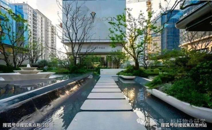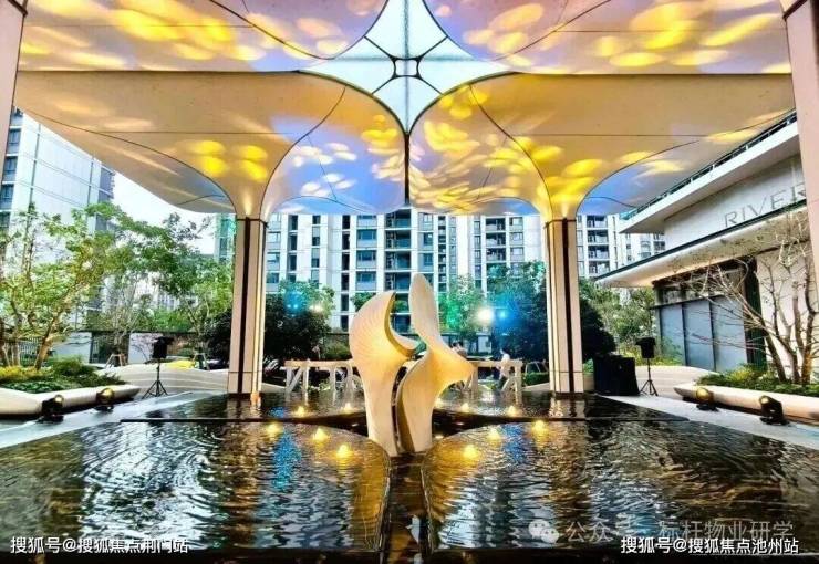 下沉式庭院巧妙借鉴自然山谷的形态,以叠水、绿阶、浮岛等元素精心构筑,呈现“飞瀑挂崖”的生动景致。庭院中央的女王画舫若隐若现于林水之间,业主可在此品茗赏景,尽享“都市女王”般的优雅与从容。