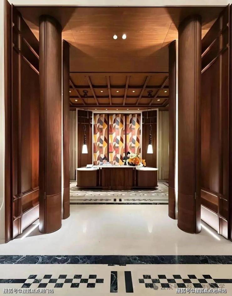 玉树门庭,传承芝澜月华的优雅入口,墙面采用贝金米黄石材,高达7米的玉树构架以UHPC材质精心打造,柱身巧妙嵌入蓝翡翠玉石与亚马逊绿奢石,尽显奢华与精致。
