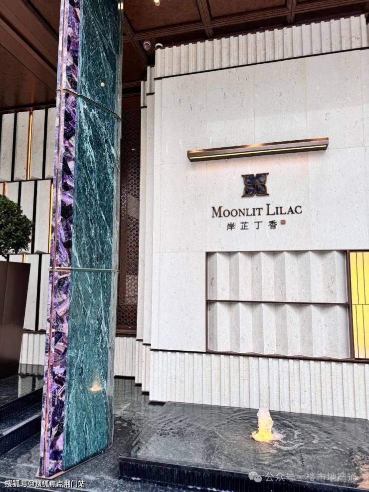 从大门开始卷起,贝金米黄石材+两侧叠水呼应,6根紫水晶+普拉达绿奢石柱阵(紫气东来,六六大顺);头顶为仿铝板吊顶,丁香LOGO铜制格栅左右对称