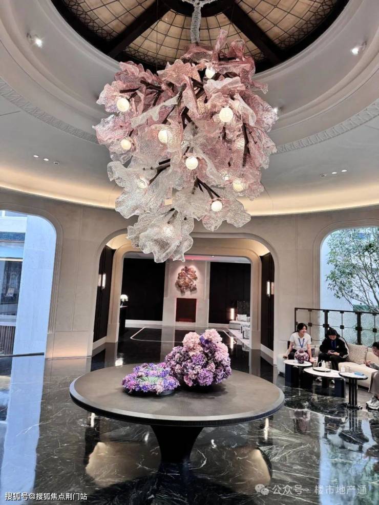 步入示范区,踏入空中廊桥,底部就是下沉式庭院(会所);接着进入圆厅,正中央一个巨大的丁香花瓣雕塑悬空而下,和案名遥相呼应,仪式感从此刻凸显