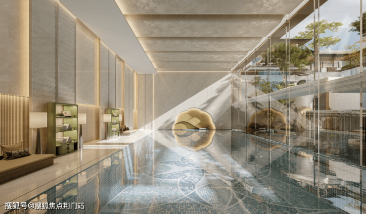 中庭大片的薄水池,甚至还一路从室外漫溢到会所室内,堪称奇观。这是杭州豪宅从未有过的“边界消融美学”。