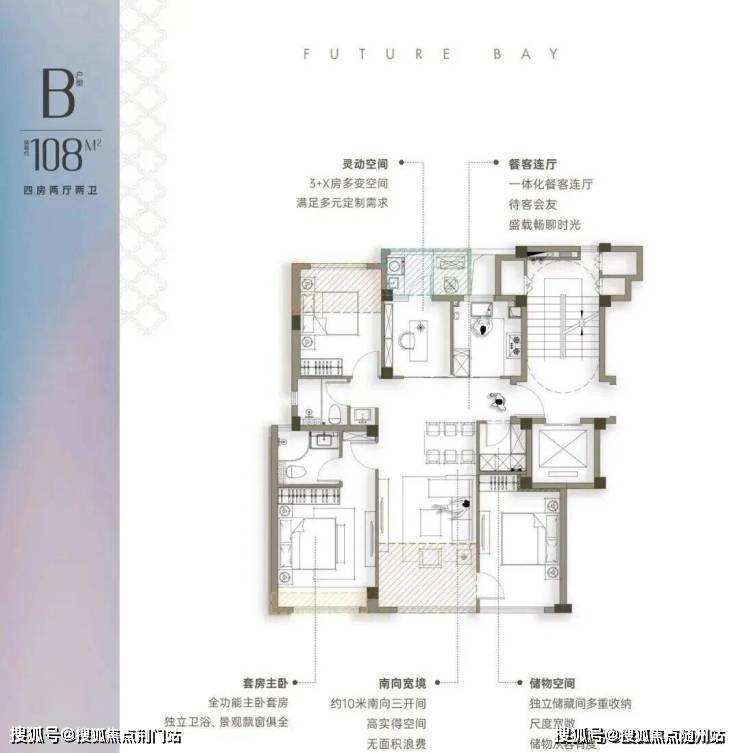 约108㎡的户型则设计了3+X灵动空间,无连廊确保南北通透,采用四叶草布局,卧室分布于四角,互不干扰。