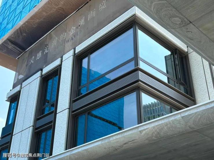 湖映金沙的外立面古典一些,它没有芝澜/玉澜那般华丽的玻璃幕墙,我觉得它们自己写的“金澜画境”还是准确的,就是金色的窗框层面分明,这是风格上的迥异,审美也不应千篇一律,重要的还是铝板+石材的运用,这在限价时期的金沙湖倒是不常见。