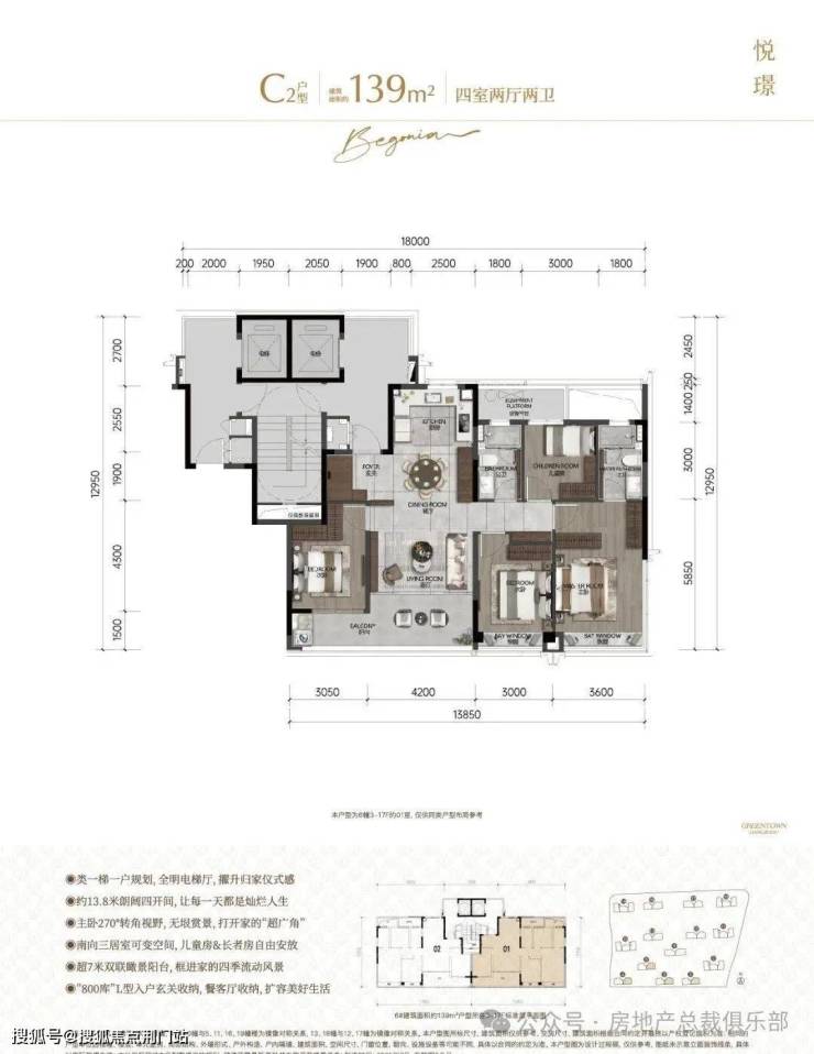 139㎡C3户型·四房两厅两卫,尊享一梯一户私密归家体验,匠心独运,入门即享光之盛宴,南北畅通风韵;四开间均朝南,南向面宽达13.8米,空间布局严谨考究,方正格局,配备充足收纳区域;主卧配备270度全景视角,尽享无限风光。