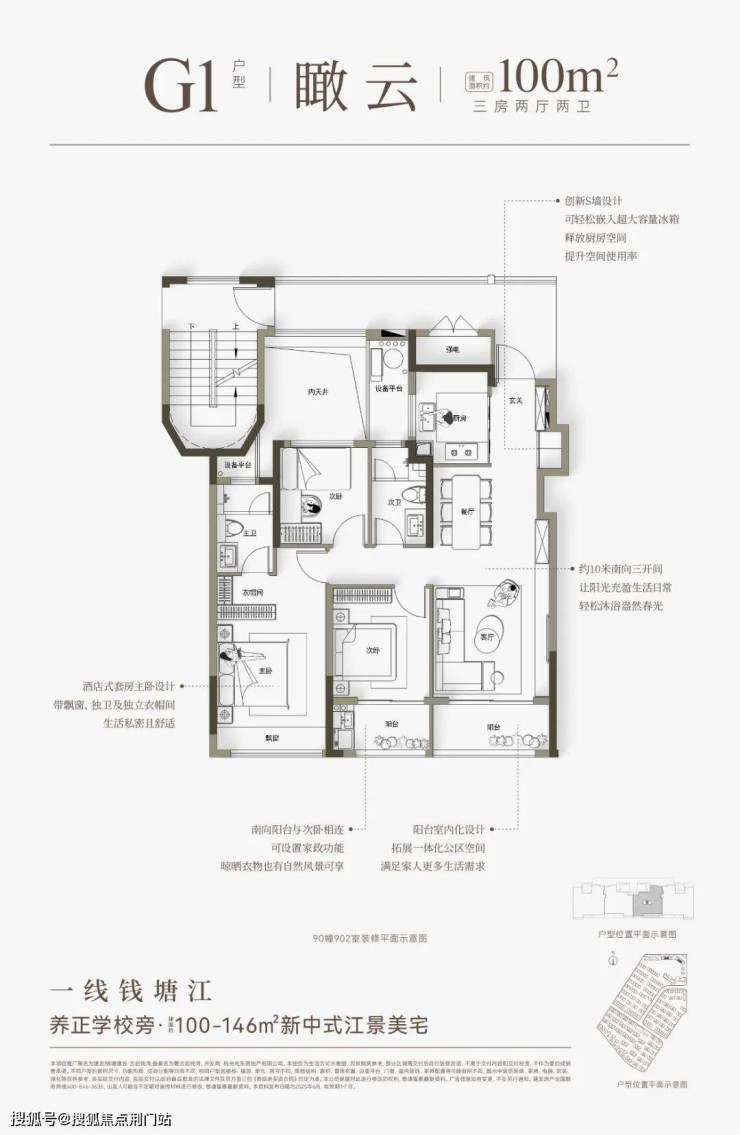建面约100㎡户型,三开间朝南,S墙和可变开放式厨房,很对年轻人的居住口味,站在楼上能够对中式园林景观一览无余。