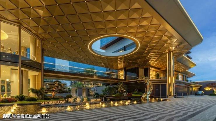 与这两年流行的“阔绰”门头相比,这座鎏金门头最大的亮点是通透——不仅顶部有一个圆形的镂空,偏置的大堂也为风景让了路,正前方没有任何遮挡,反而把最精彩的立体花园化作一幅动态图景,点缀了整条街道。