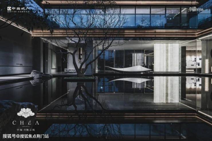 这座水庭也是一整面「水镜」,将中心的乌桕树、周围的超大白玻、精致的艺术雕塑都倒映其中。