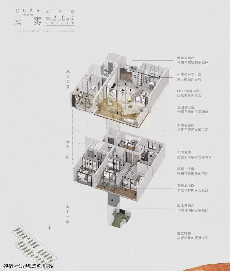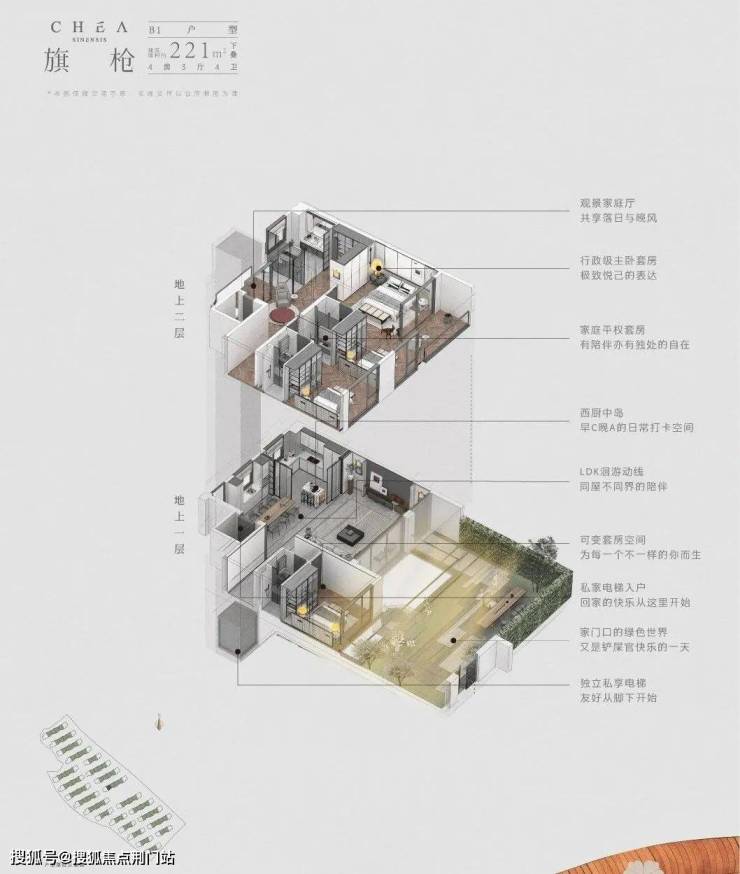 以中间套下叠“旗枪”户型为例,利用地势高差做了下沉式庭院,由于是坡地地形,所以即便是地下空间,也有大面采光;二楼则设计了挑出露台,拥有大面积室外空间。