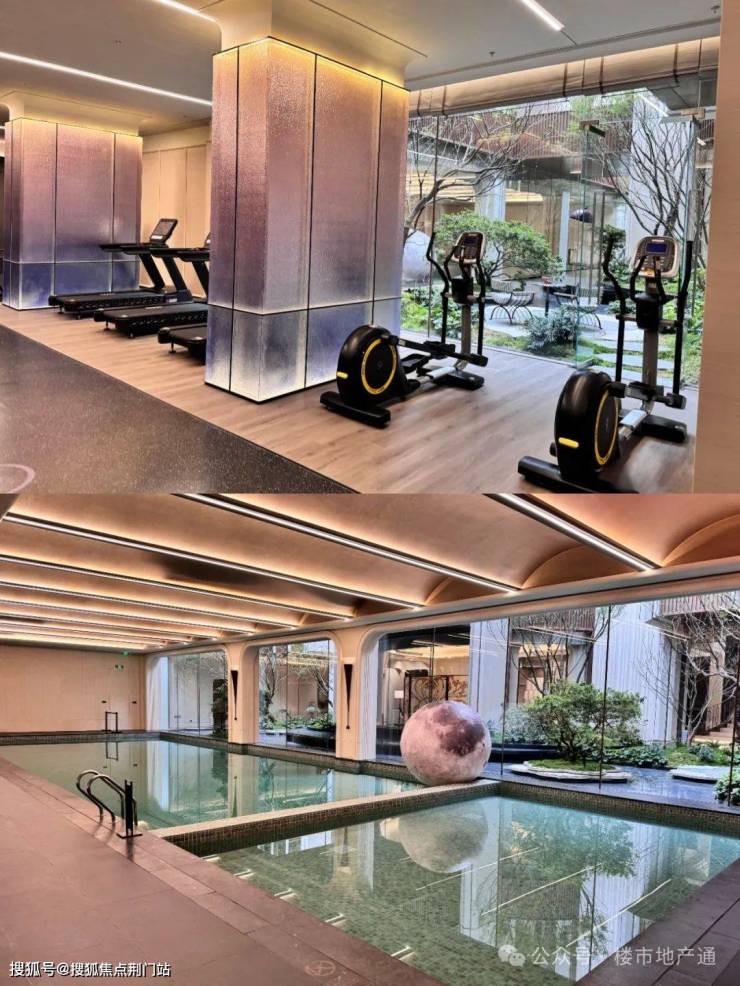 下沉式庭院通过旋转楼梯进入,内配恒温泳池(分为童玩泳池和成人泳池,顶部圆形拱顶)+健身房(器械很少)+会客厅