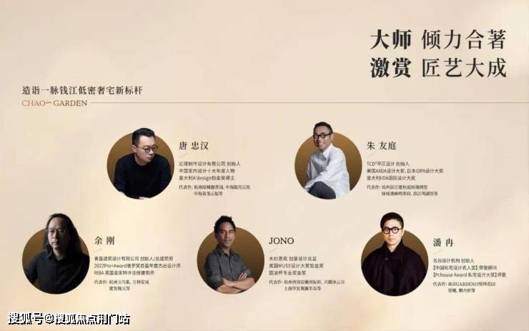 力邀近境制作创始人唐忠汉、TCD²平仄设计创始人朱友庭、木杉景观创意总监JONO、名谷设计创始人潘冉、青墨建筑设计创始人余刚5位设计名家重磅携手.集匠艺之大成,共筑金沙湖当代奢宅新标杆.
