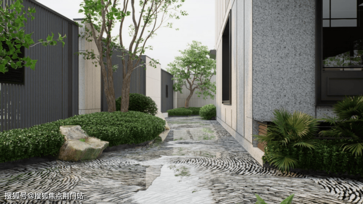 不同于市场上部分联排院子的局促格局,金翊·金云院每户均配备南向方正庭院,部分户型更享前庭后院的双重景致。例如建面约293㎡的户型,以"多进式"布局营造渐进式的归家体验:前厅以水为引,叠水景观自然成趣;侧院铺就蜿蜒小径,点缀灌木与景石,形成“一步一景”的过渡空间;后院则以静思休憩为主,铺展草坪种植树木,尽揽天光云影。