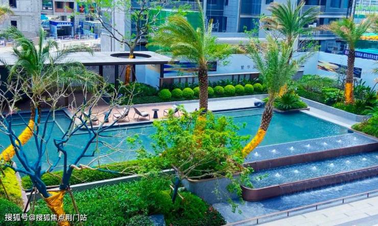 置身景观廊架之下,纵眼望去,东南亚棕榈科植物阵列其间, 约 183.5㎡ 亲子戏水池、酒店感礼仪水景相映成趣,绿荫草木、天光云影倒映于缓缓流动的水面上,宛若一幅立体的江山画卷,流动生活的无尽遐思。