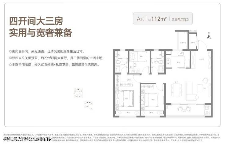 建面约112㎡的三房两卫,是双卧朝南的边套全明大三房,适合家庭人口少,但对居住舒适度要求高、且有一定经济实力的购房者。