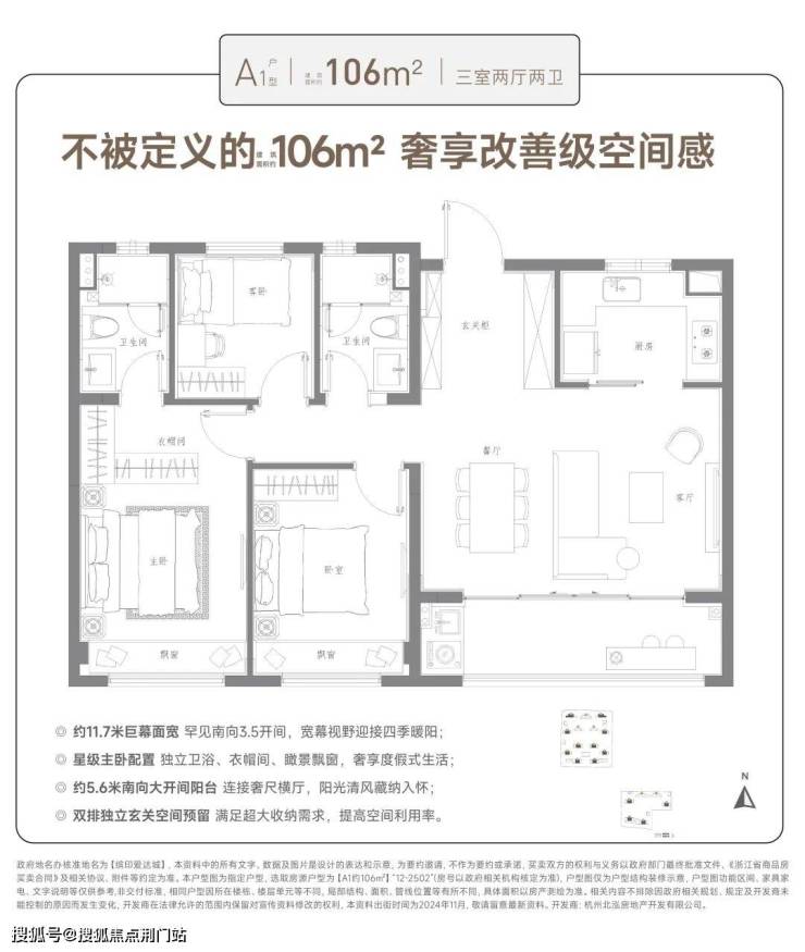 与常见的中间套户型不同,招商蛇口·爱达1872的建面约106㎡,南向有3.5开间,面宽约有11.7米。