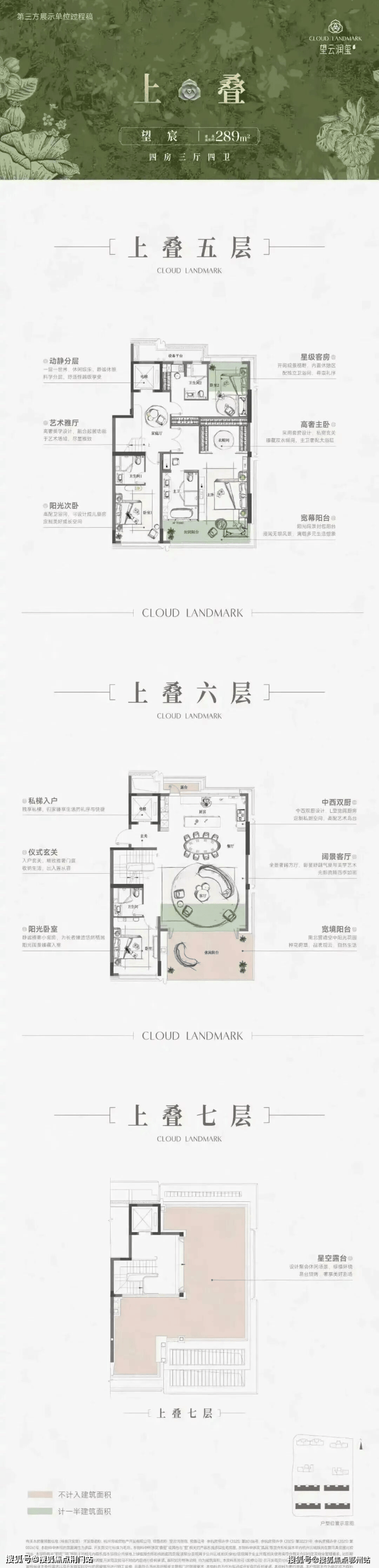 建面约289方上叠户型,一层阳台、主卧套间连通,阳光次卧、星级客房,还带家庭厅;二层宽境大露台、餐客厅、厨房等,可打造洄游式欢聚场……