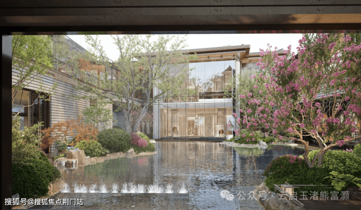 建发建杭云启玉渚的园林是在原来基础上升级过的,这次拿出的园林设计更加的立体。最核心的景观就是下沉庭院,跟地下会所联通,中间是一大片开阔的水域,旁边游廊围合,