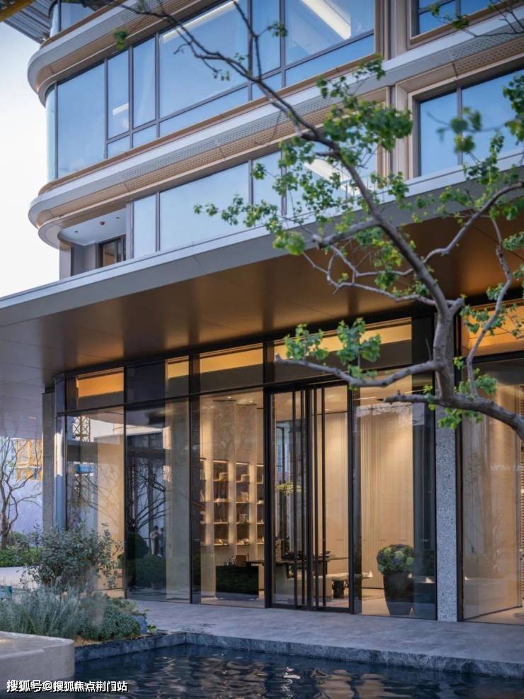 玉湖之星传承千年的玉润文脉,在材料动用上,突出玉、白、润、贵的格调,从钟鸣显赫的主入口,到泛会所、下沉式庭院、背景墙,大量选用贝金米黄石材、海浪灰花岗岩、水纹玻璃等景观材料,而且用了大量复杂的弧形和拉槽工艺,和立面相呼应。