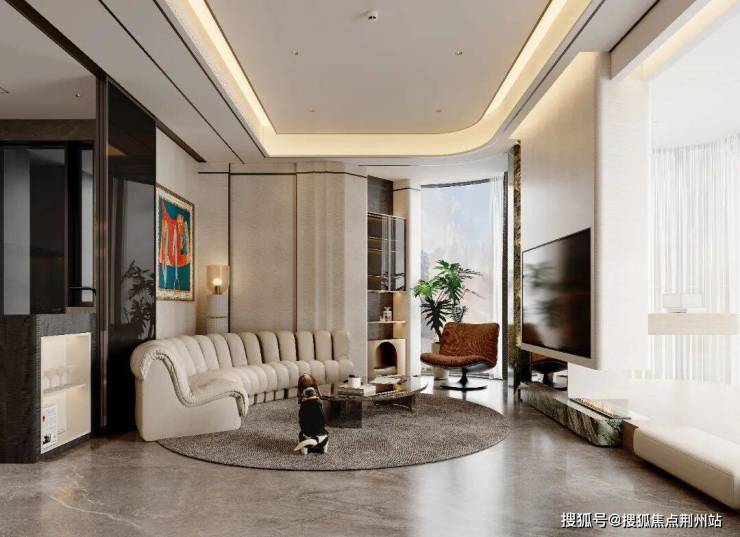 与沙发对应的电视背景墙,设计师运用了悬浮+弧形的设计手法,打造更具设计感和艺术感的背景墙装置,沙发和电视背景墙的搭配稳居客厅C位,把空间的高级感和贵气展现得淋漓尽致~