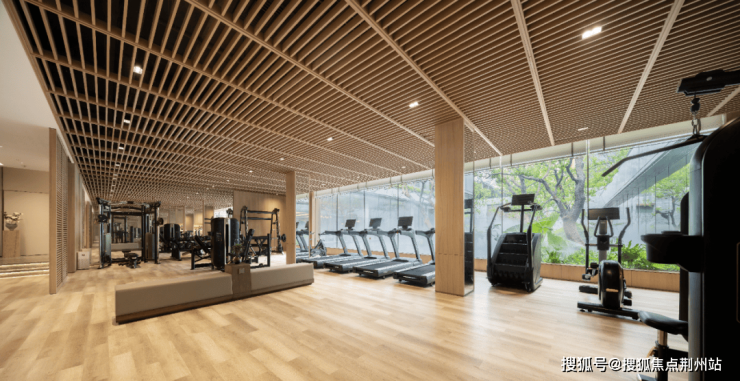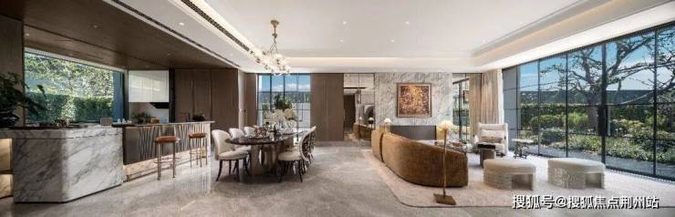 项目打造了约1300m²的全能会所,设置了恒温泳池、健身房、影音室等区域。恒温泳池一边是全屏落地窗,直面下沉庭院,另一边的背景墙由艺术大师打造,呈现雅奢艺术感。