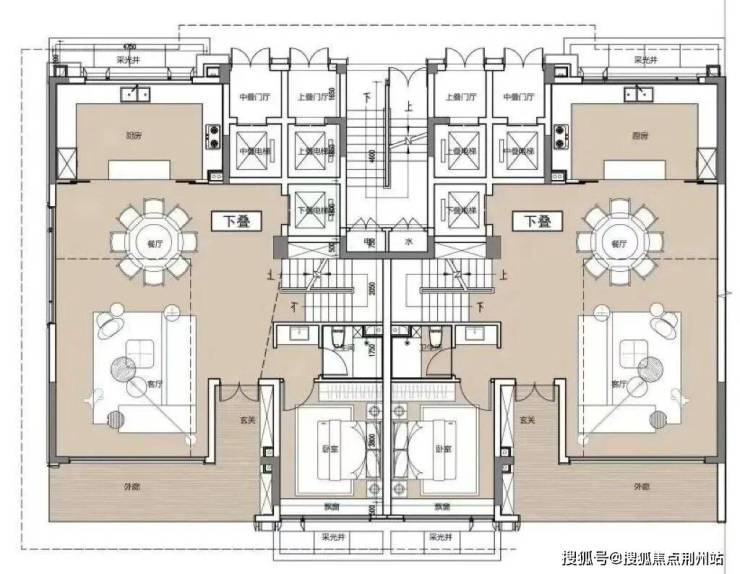 叠墅下叠一层南向面宽约10.3米,玄关连接外廊,下叠二层,客厅挑空,南向开放阳台,双套房设计。