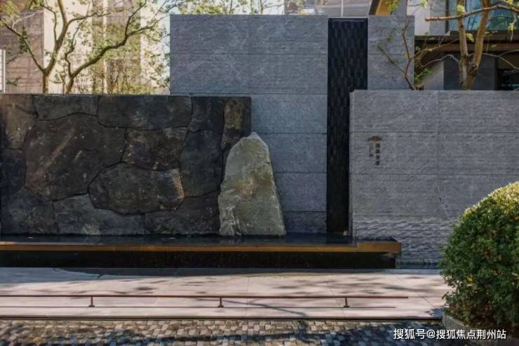 水景景面采用安哥拉黑石材定制,融合双波浪面、单弧面及皮革面三种肌理,