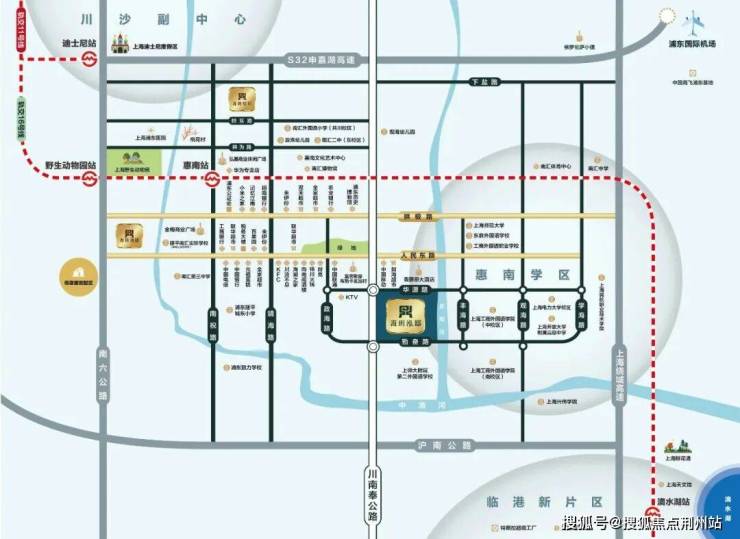 项目位于惠南镇核心区域,距16号线惠南站直线距离约1.5Km,周边1公里内生活配套醇熟,商业、医疗、生态资源优越,全龄化的优质教育配套环伺。