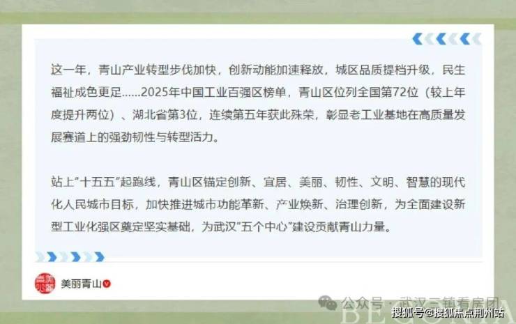 青山区,2025年中国工业百强区榜单中位列全国第72位、湖北省第3位,创新动能加速释放。(数据来源:美丽青山公众号)