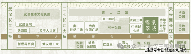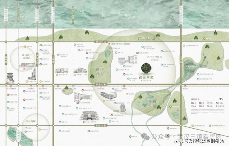 项目矗立于八个公园群落中,距离青山公园约200m,江滩公园约800m,距和平公园约2km,绿意交织,翠微入怀,生态谧境举步即达。(以上数据为百度地图直线绘测)