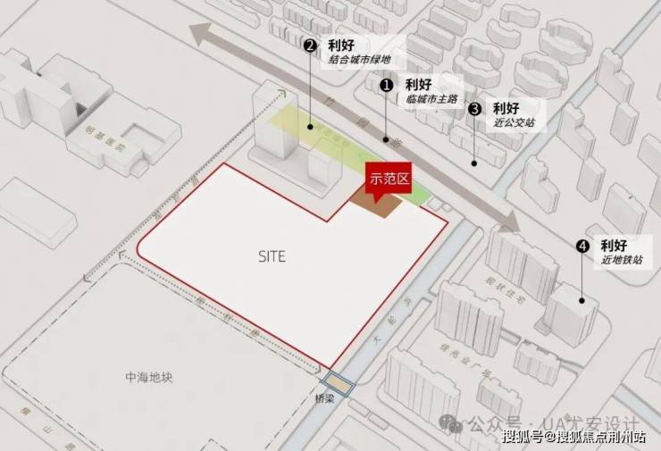 在「兰」生活馆的选址上,设计剖析临城市主路竹园路的西北角位置,紧邻城市绿地且近地铁站及公交站,整体规划可借用城市绿地做前场景观,达成项目昭示性和可达性俱佳。