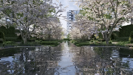北看「心林物语」水景花园,水景与社交空间无界交融,池涧烂漫重拾宁波枕水而居情怀。南瞰自由疏朗的阳光草坪、中轴花园,水上樱花画境,四季诗意风景流淌,迷人景致随时光变幻。