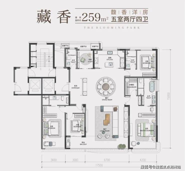 建筑面积约259㎡方正大五房,南向约17.5米大面宽,通风、采光居住舒适度提升。私享礼制玄关空间,彰显大宅优雅归家气度。LDKB通厅设计,约90㎡社交公区;3+2套房的酒店式居住奢享,家庭成员各有私属的生活空间,实现空间平权化,满足四代同堂居住理想。
