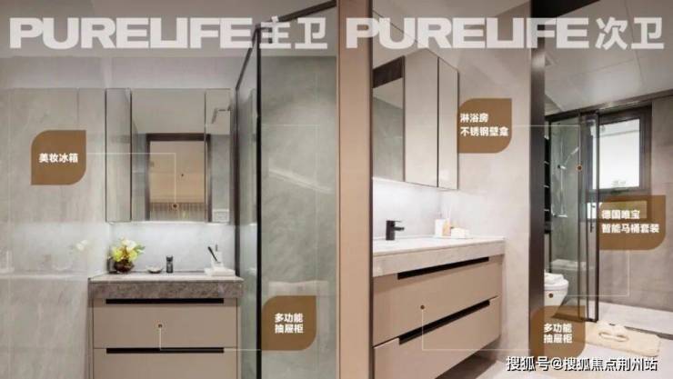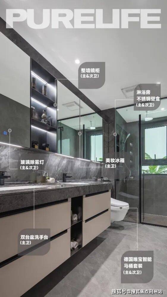 卫生间七大细节设计亮点——主卫双台盆(仅143户型)、除雾灯(仅143户型)、大容量镜柜、主卫美妆冰箱、多功能收纳抽屉、不锈钢壁龛、唯宝智能马桶。