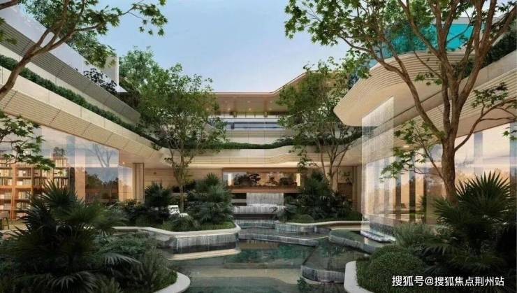 “漂浮的绿洲”,九重层次下沉庭院,区域悬浮泳池+4.3米飞瀑设计,塑造极致度假感受,丰富的视觉奇观。