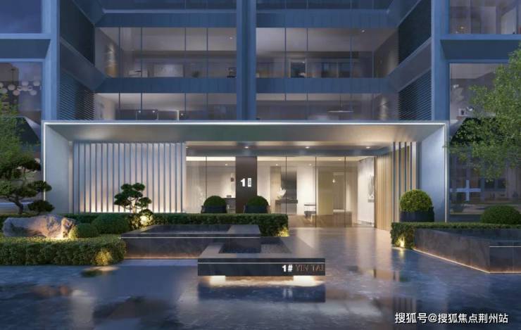 建筑立面现代挺拔,采用全铝板贴面,符合高端办公和公寓的配置,在此基础上,改造内容包括:大堂出入口、增加楼栋首层泛会所、增加公共会所泳池、优化园区标志性主入口。主入口采用干挂芬迪黑石材、普拉达绿石材、古铜色铝板等进口材料,整体现代且华贵,灯光点缀,调性高雅,近人尺度细节丰富,打造豪华入口,提升尊贵体验感。
