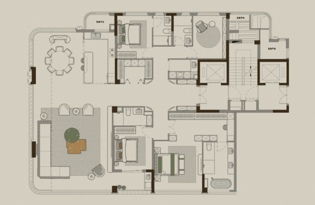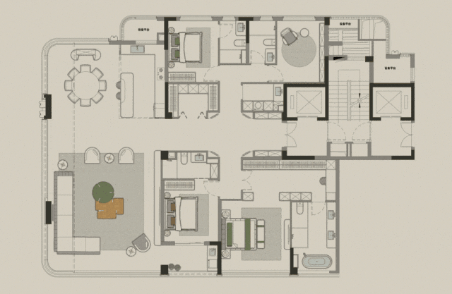 如今,“十字圆厅”在约268方中回归,让我们看到了慈溪改善的另一种可能。穿过独门独户电梯厅、超配规格的双开门,伫立十字圆厅中央,不仅将大宅独有的尊崇格调徐徐铺开,更巧妙享有强大收纳功能,预留独立家政间与储藏间,将世家礼序与天地人和一同安顿。