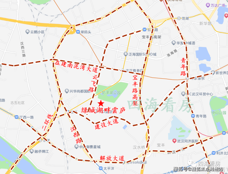 自驾:项目目前周边主要是临时通道,建好后,南临建设大道,西边靠近云飞路,云飞路是武汉CBD重要的纵向道路,可以直达CBD核心区。另外,通过汉西路向北有直接上二环线的匝道口,向南连接解放大道,可直达同济、武广商圈。走建设大道向东直达青年路、西北湖,向西几百米就有匝道可以上二环线,到汉阳王家湾等板块。