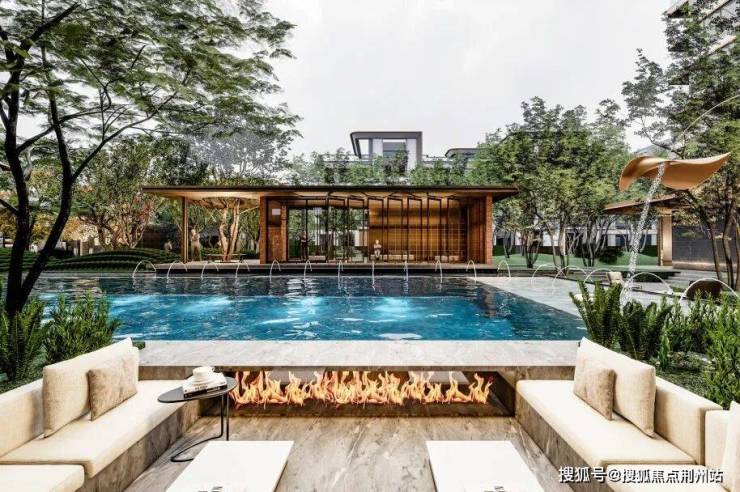 住区景观以浮岛度假泳池围合中央空间,将五重植被景观递进串联,人文活力主题架空层与泳池上方的光岛图书馆遥相对望,集合阅览、休息、嬉水娱乐、养生为一体的第二生活活力空间,容纳生活的百般志趣。