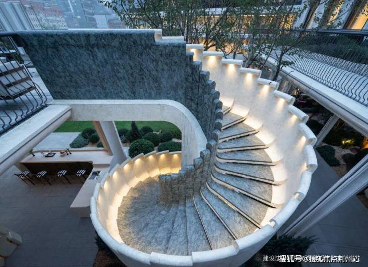 旋转楼梯以钢板为基础,通过3D扫描精准还原现场弧度,再用原料石材逐块精雕打磨,最终实现无缝拼接。