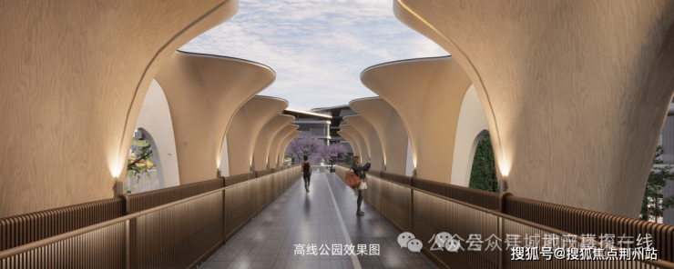 同时规划约300米的高线廊桥公园,不仅能直达会所、街区、体育中心等核心资源,从而融合小区内各功能空间、内外街道等。这个公园还能提升小区景观层次,廊桥上下也能成为不同的互动功能空间。