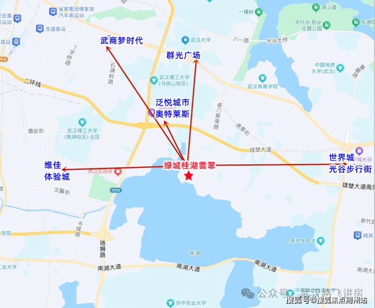 绿城桂湖雲翠位于洪山区南湖北岸,桂湖路北侧。它属于南湖板块,也可以算是雄楚大道板块。项目一线临南湖,距离雄楚大道直线仅约1公里,距离珞狮南路约1.3公里。