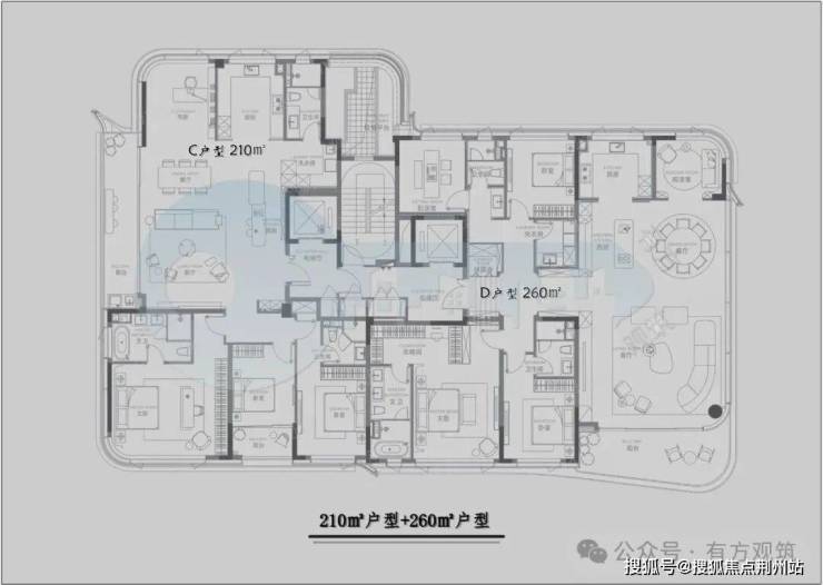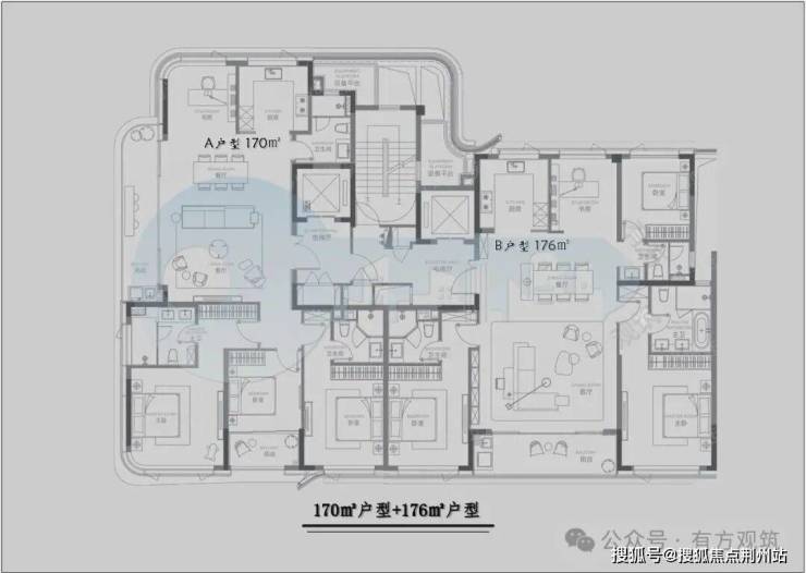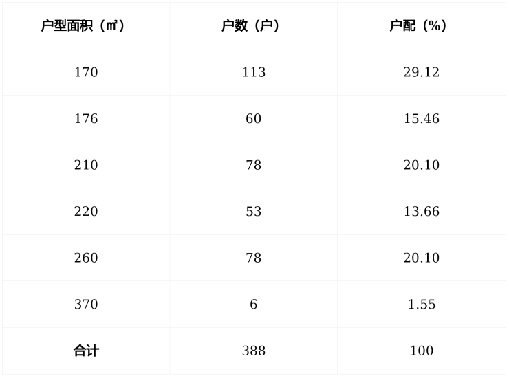 户型设计:项目户型设计一般,创新创意点较少。共3个面积段:分别是170、176、210、220、260、370。本项目户配以改善为主,具体户配如下:
