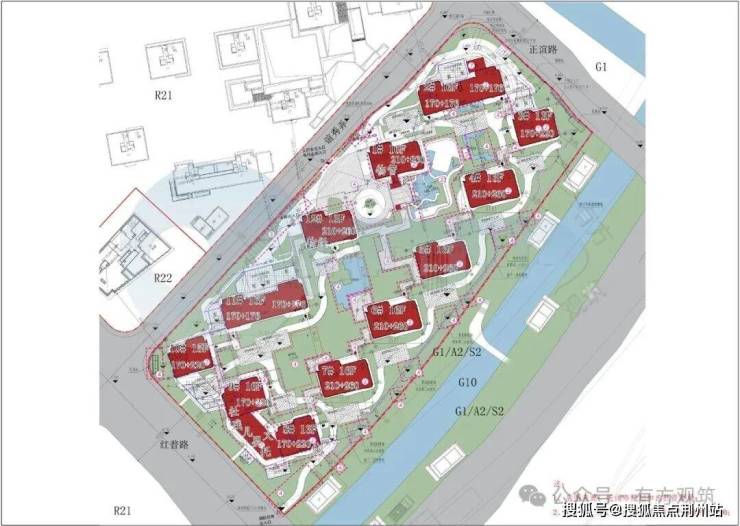 小区规划:3幢13F、1幢15F、8幢16F共计12幢住宅。呈“中心大花园”、轴对称布局;通过视线分析,让尽可能多的楼幢享受南侧河景资源;