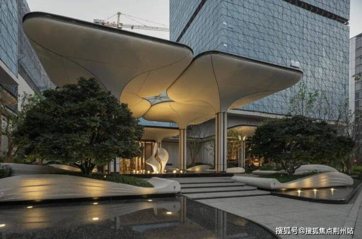 水景以三面环抱之势映衬建筑太空舱,使其在视线上宛如漂浮于镜面之上,营造出建筑轻盈悬浮的诗意画面。