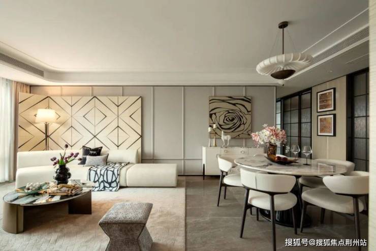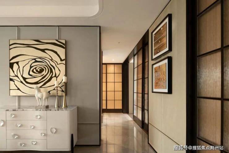 客厅背景墙、玄关柜、卧室门一体化设计,构筑出连贯舒展的视觉界面。功能隐于行制,秩序藏于美学,生活的细碎痕迹被温柔消隐,只余纯净与从容。